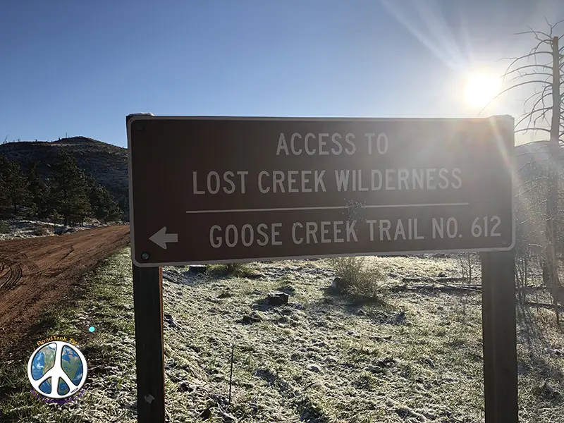 - Trail head sign into Lost Creek Wilderness at Goose Creek Trail Head, Osprey pack, doing stretching’s and getting the trail mojo going on…